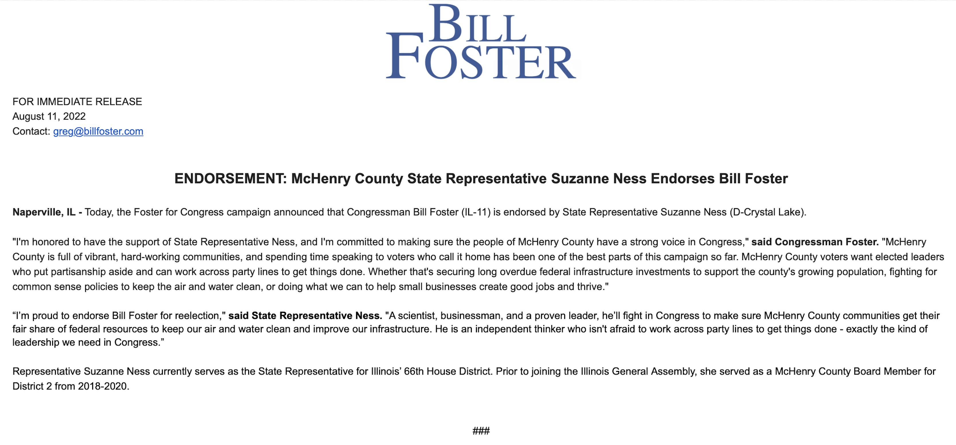 ENDORSEMENT: McHenry County State Representative Suzanne Ness Endorses Bill Foster