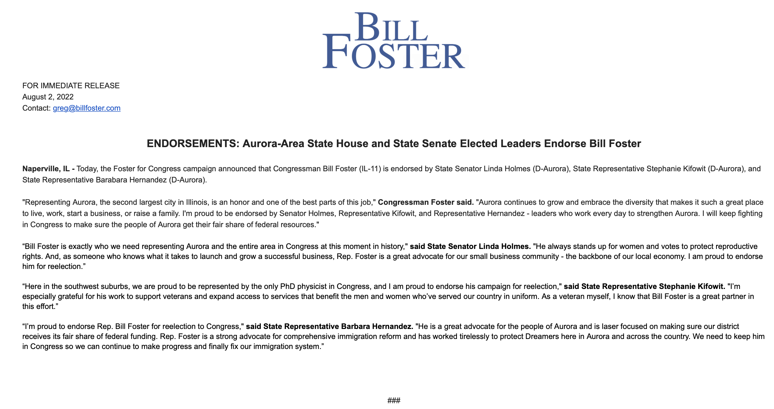“Representing Aurora, the second largest city in Illinois, is an honor and one of the best parts of this job,” Congressman Foster said. “Aurora continues to grow and embrace the diversity that makes it such a great place to live, work, start a business, or raise a family. I’m proud to be endorsed by Senator Holmes, Representative Kifowit, […]